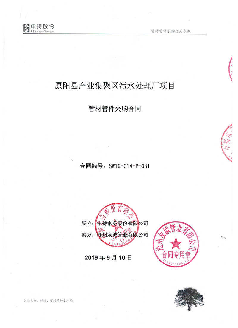 2019年9月份,友誠(chéng)管業(yè)與中持水務(wù)股份有限公司(上市公司),簽訂了原陽(yáng)縣污水處理廠項(xiàng)目的防腐螺旋鋼管合同,非常感謝貴公司對(duì)我們的信任,我們也一如即讓的做好每一支鋼管