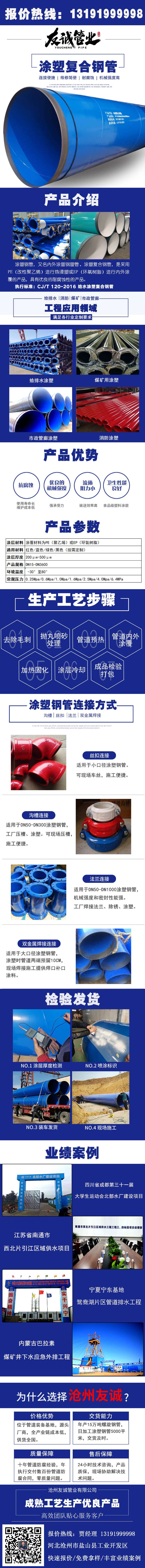 法蘭連接涂塑鋼管,又名鋼塑復合管、涂塑復合鋼管,是采用PE(改性聚乙烯)進行熱浸塑或EP(環(huán)氧樹脂)進行內(nèi)外涂覆的產(chǎn)品,具有優(yōu)良的耐腐蝕性能。同時涂層本身還具有良好的電氣絕緣性,不會產(chǎn)生電蝕。吸水率低,機械強度高,摩擦系數(shù)小,能夠達到長期使用的目的。還能有效的防止植物根系及土壤環(huán)境應力的破壞等。連接便捷、維修簡便。