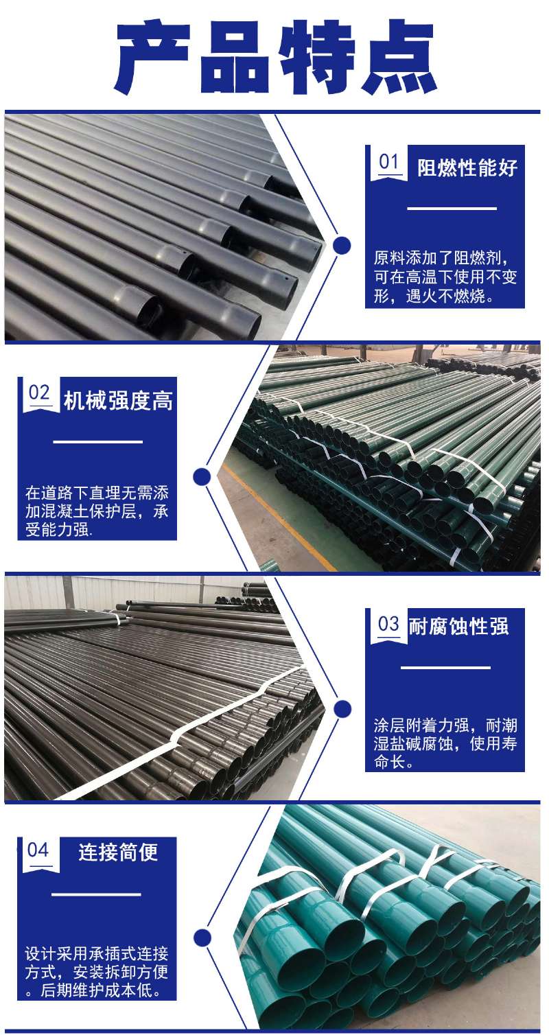 5、內(nèi)壁光滑,不易刮傷電纜。設(shè)計(jì)采用承插式的連接方式,方便安裝連接。接頭處加橡膠密封圈封既適應(yīng)熱脹冷縮,又防止泥砂進(jìn)入。
